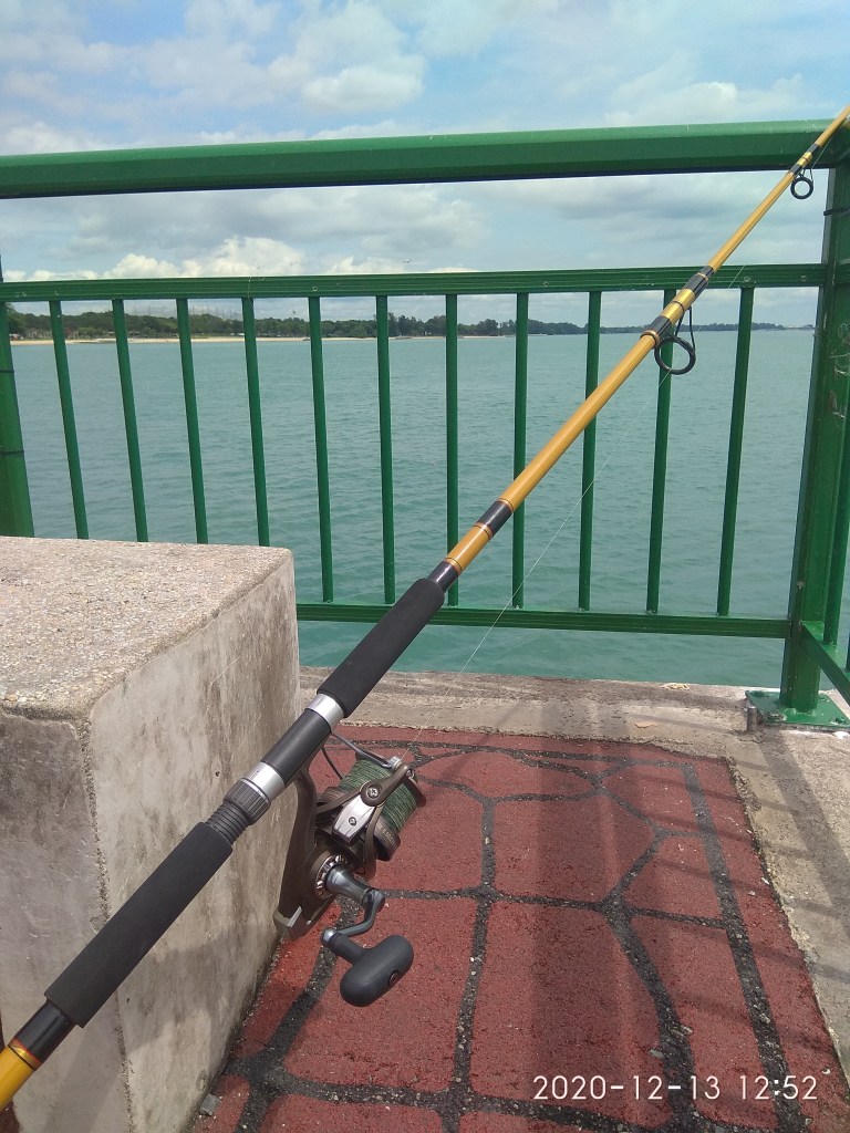 No choice stop for awhile and take my early lunch. Finish and while i was resting ….I saw my spinning rod the tip ripple…went forward and before i able to take the rod, the reel scream….fish took the bait and run out..I strike hard…yes fish on…It keep running for awhile and it really excited me especially you see the spinning spool spin.
