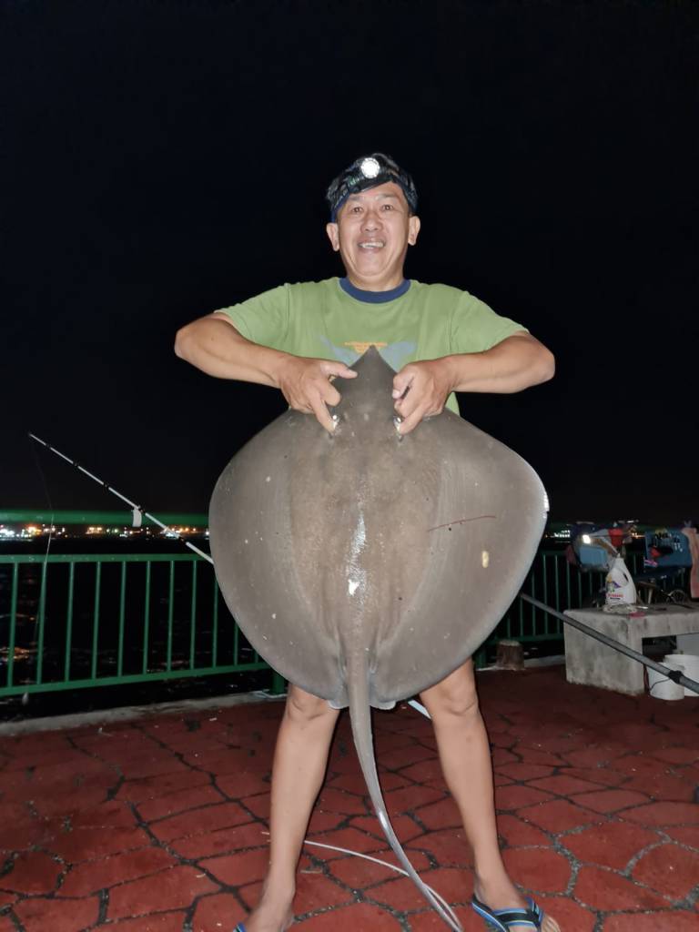 Nothing happen until around 10.30pm. When we were chatting, I heard sound of something rubbing against the jetty railing. I turned around to look at my rod and the tip was bending downward with my line running out. Quickly I rushed forward pickup the rod and strike…Yes fish on…It keep taking my line out with the reel spool spinning at high speed. I had to few time adjust and tighten the drag to slow down the spool rotating. The fish stopped for awhile and I quickly pump n pump to lift it off the seabed. After some hard struggle, I was on the winning side. I slowly get it up to the water surface when it was nearer to the jetty. Johnny was ready with the gaff and he brought it up. Almost 11kg when we weighed it.