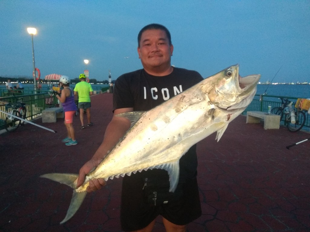 Around 1900hrs, Ah An surf rod sets got a short scream on the reel. I shouted to him and he strike hard. His rod had a good bend on the tip part and I know it is a good size fish. I start preparing my gaff. The fish initially fought hard. But gave up half way into the fight. Ah An manage to bring it in near the jetty and I gaff it up. WOW!!…a big Queen fish…Quite long we never see this type of sizeable fish appear on the jetty. I weigh it and it hit the scale at 5.3kg.