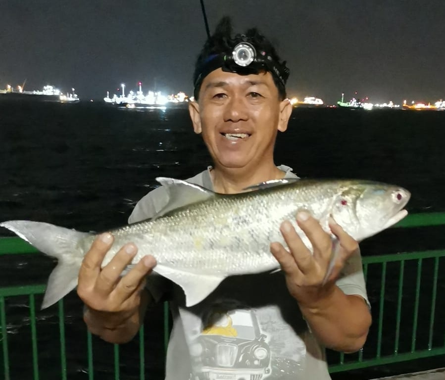 Another night of short trip. Manage to jig some fresh bait before last light. Tide is on the way up and the current flow was smooth. Just about another half hour to go before full tide, the current started to change direction. I saw my rod tip rattle. I waited for it to bend then I strike hard. The fish quickly swim inward. When it almost surface up, it take a deep dive downward stripping some of the line out. I had to resurface it and saw it was a Threadfin. I steady the fish and use my rod to haul it up. Luckily it only hook on the side of the mouth and the hook part already had a tear opening. If I had delay, I might lost the fish.
