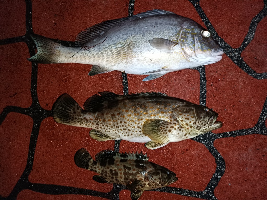 Friend Wong Poh caught two grouper on a handline with frozen squid as bait. The bigger one is 1.6kg. Later in the night, he caught a 1.3kg sweet lip aka kaci fish on his Penn Slammer surf rod pair with a Abu 7000 multiplier reel and fresh squid as bait on a bottom feeder rig. A good catch beside the daily raining season.