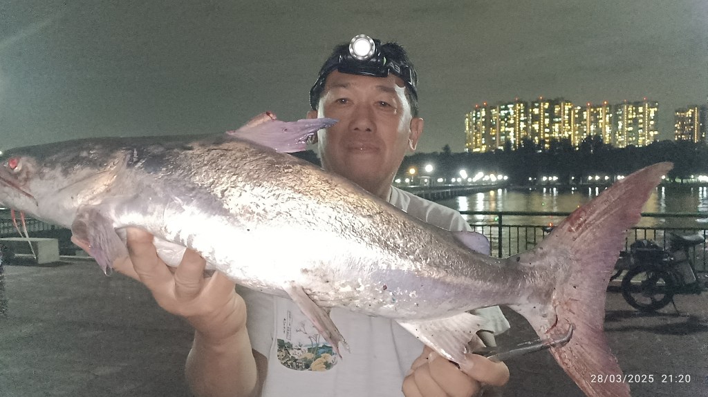 Caught this Marine Cat fish when the tide was mid way up. Current flow was fast and the fish flow along the current after taking the bait. I saw my rod tip rattle and line gone slack. Gave a hard strike and it struggle along the way in. Surface it up and a fellow angler help to grab my leader and haul it up. Estimate about 3kg in weight.