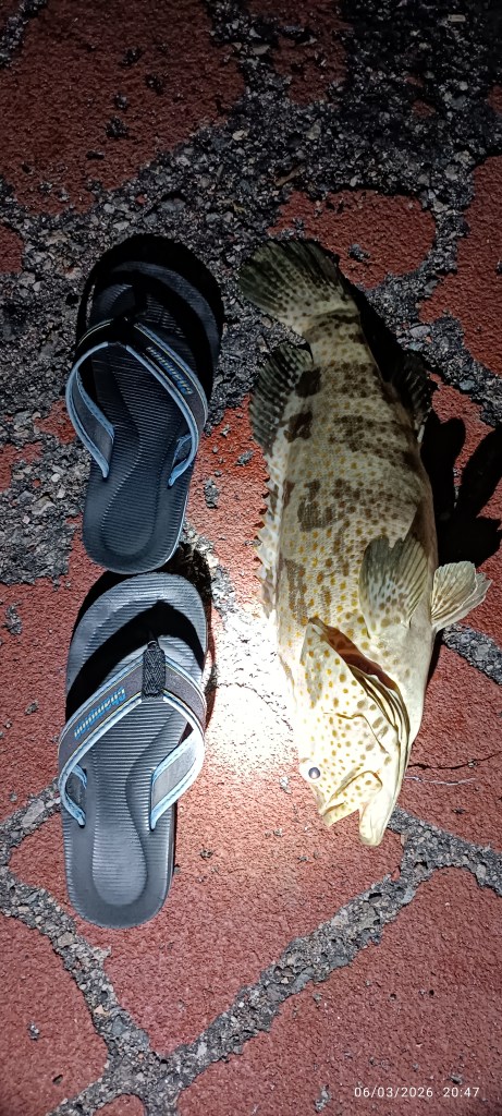 Tide was on the way up. Current flow was smooth. I saw my friend surf rod tip rattle once. Went over and wait. When it bend the second time i strike hard. Fish On….I slowly wind back and the fish struggle along the way. When it surface up near the jetty. Grouper ..I get friend to hold the rod and i grab my squid pole net to scoop it up. Yes..1.6kg it weight.