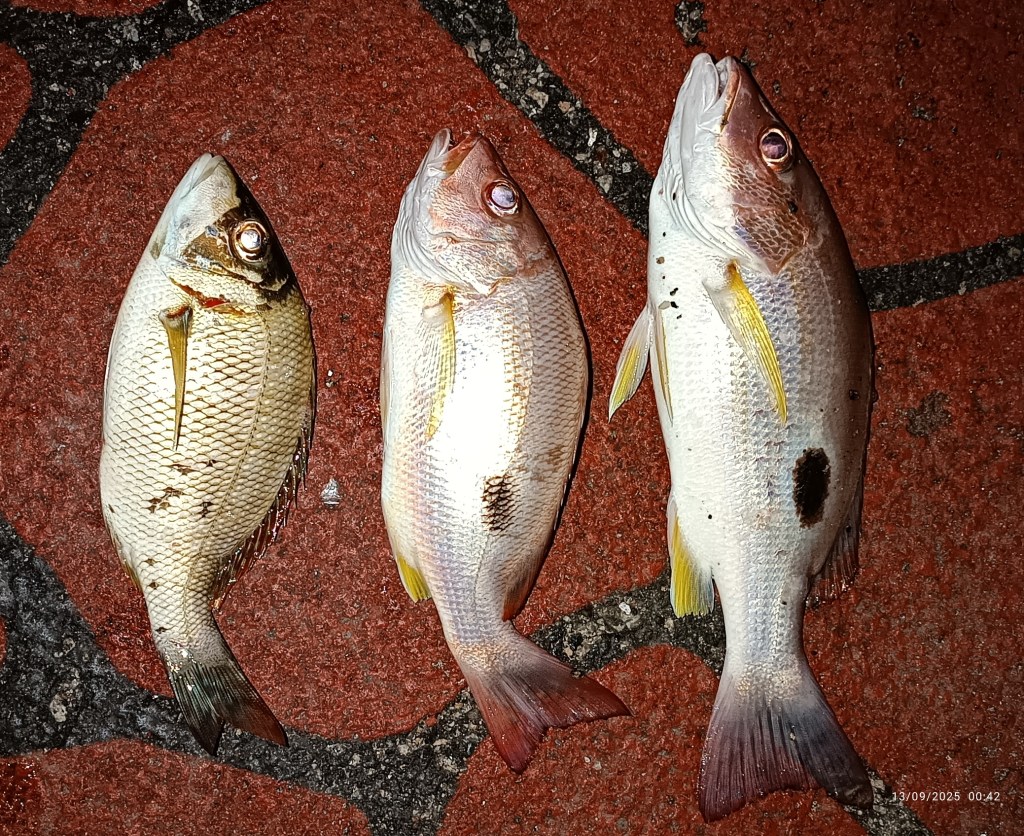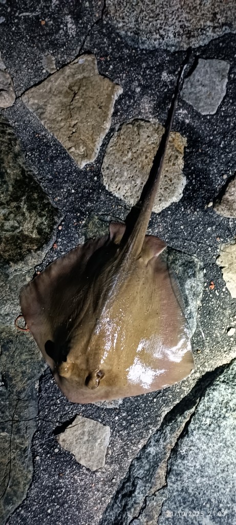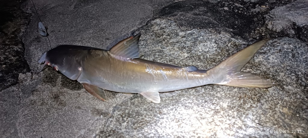 Friend can’t go along tonight so i went alone. Tide was on the way up. Water was still low when arrived. I waited until water is high enough before cast out. First to strike is a fingermark snapper. Follow by a stingray which cause my rod to bend n reel screech. Next is another fingermark snapper when tide is much higher. Last is a marine cat fish when tide is full. Stingray n cat fish released back.