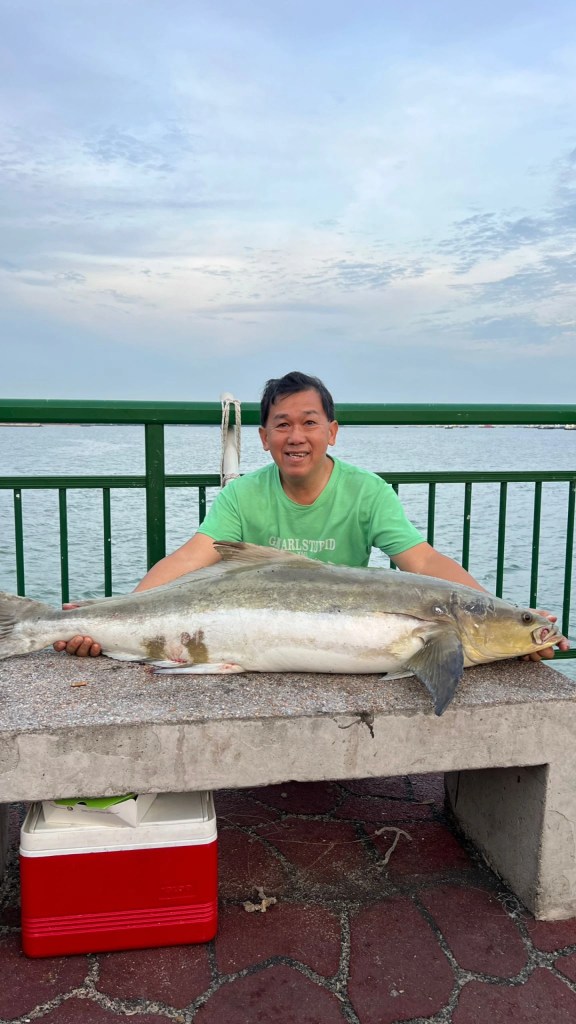 I had reach jetty and setup my tackle. Tide is on the way up. Leong come about 20 minutes later and just put down his backpack. Then he heard reel screaming sound. ” Leong tolong” he heard also. He look at the mid way of the jetty. Apis is fighting hard on his rod. The fish has took his bait and start to run toward deeper water. This mean Apis had to bring his rod and cross pass through 3 lamp post before can continue to fight the fish. Leong went to help him.