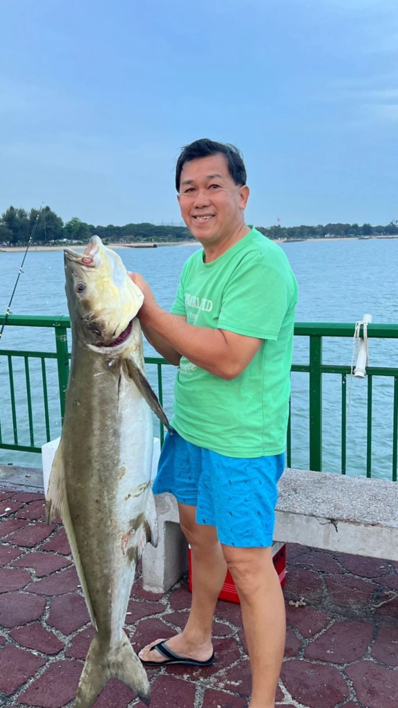 As it come close, my friend manage to gaff it on a second attempt. I quickly put down my rod and grab my own gaff to put in a second one. Two gaff in, we both pull it up. It weigh 22+kg. This is my second biggest cobia caught at the jetty. My biggest was caught at year 2007 weigh 25kg. Later the night we cut it up and share among my friends.