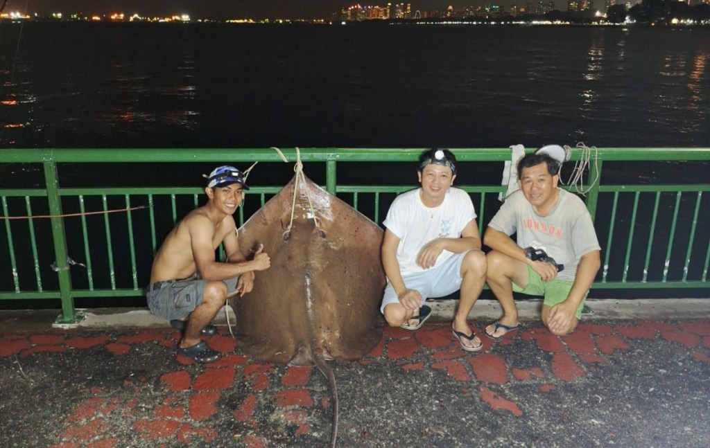 Now the fish is already at the end of jetty. After awhile of struggling there, due to the tide coming up, the fish goes along the current flow and come to the right end side of the jetty. By now both of them already tired out but the fish is still in mid water and refuse to surface up. “Alo” Leong call me. I went over, took over the rod. Slowly i pump the rod. I can feel the fish is also tired. After awhile it begin to surface up. “Wow” big. Brown stingray. I put more pressure on the rod and gave no chance for the fish to go down. As the rod is not strong enough to handle this weight, I take awhile to bring the fish to come closer. Leong gaff it once when it come close enough. Apis hook the second gaff in. Two of them try to pull it up but half way only. I had to put down the rod and get my gaff. Three gaff in, we pull it over the railing. Yes….landed. I weigh it and it hit the scale of 45.3kg but the long tail still on the floor. So it should be around 46kg if totally lifted up.